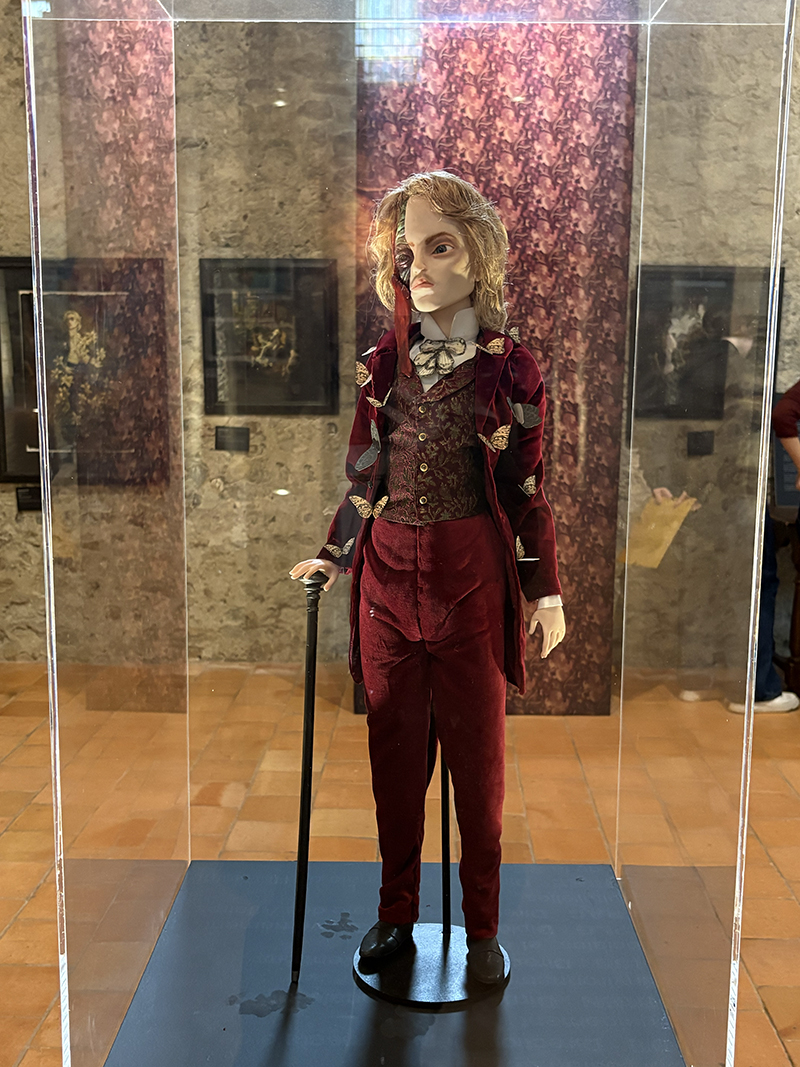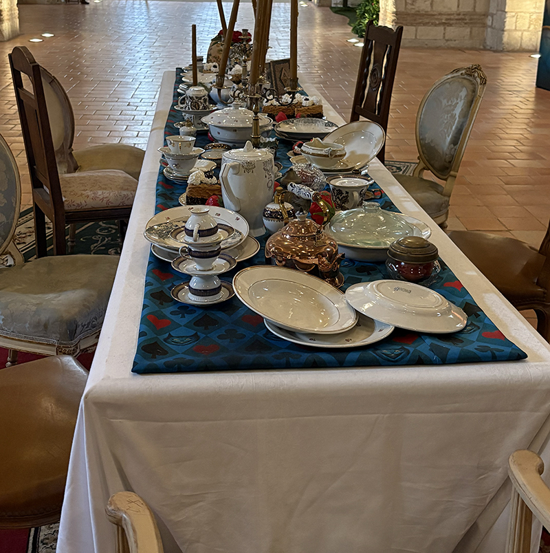 À peine la porte franchie, on se prend une première claque devant la beauté du lieu. La Collégiale Saint-Martin est un monument majeur du patrimoine angevin, chargé d’histoire et d’architecture. Pour la minute histoire & culture : c’est la plus vieille église d’Angers et l’un des monuments carolingiens les mieux conservés de France. Ses constructions couvrent près de 15 siècles d’histoire. Alors recevoir les œuvres si fortes et particulières de Benjamin Lacombe en ces lieux était un pari audacieux. Et pourtant, la magie opère. Sous les voûtes de la Collégiale, les illustrations sont tellement mises en valeur. À côté des nombreux dessins, une scénographie était présentée, avec notamment une grande table de réception dressée et joliment décorée.